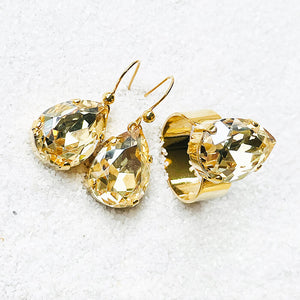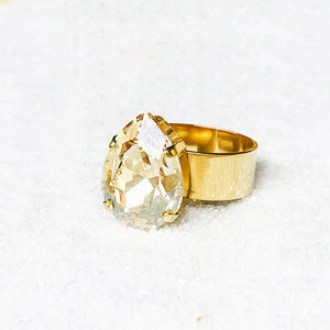 Extra shimmery Crystal Golden Shadow Swarovski in a high faceted pear shape set in an adjustable 24k gold plated band.