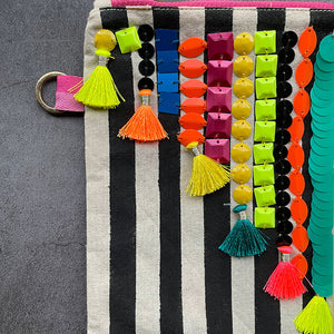Hand painted black stripes with lines of individually hand beaded lines of sequin and tassels.