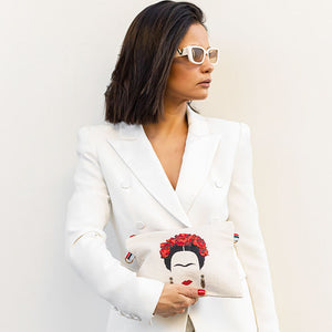 A thick cotton base with hand painted Frida wearing a hand embroidered flower hair piece and sparkly Dazzle earrings in gold.