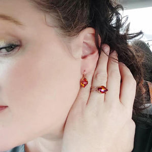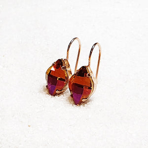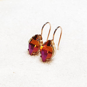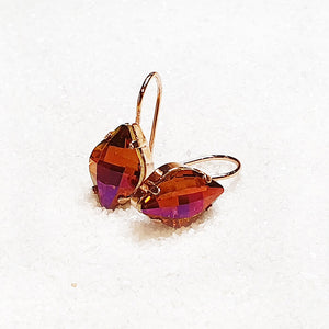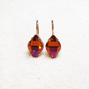 Besides the primary burnt orange tone, the crystal has tones of gold, copper and purple set in the blushing rose gold. These gorgeous earrings are exquisite with a side of foxy