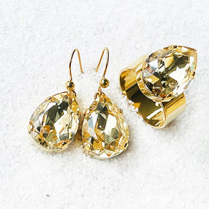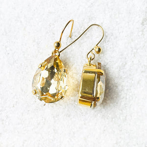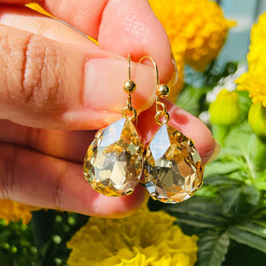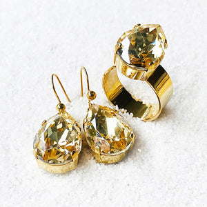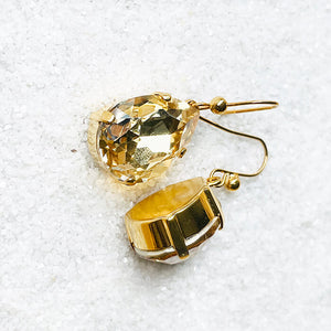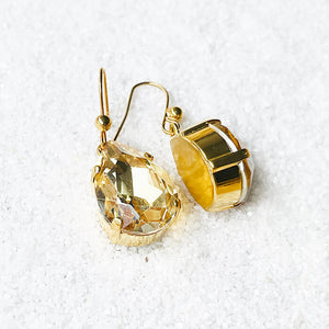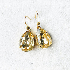 Crystal Gold Shadow Swarovski in a pear shape set in 24k gold plated drop earrings.