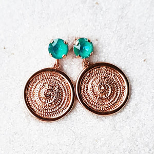The brightness of swarovski combined with an elegant rose gold disc drop makes a statement while playing it cool and easy of your ears. Shine bright with these stunning rose gold dangle earrings.