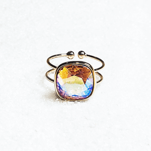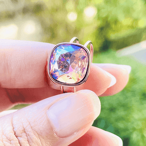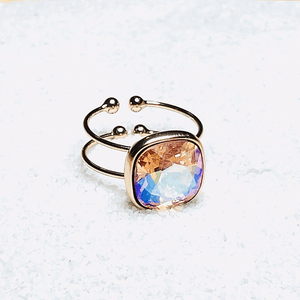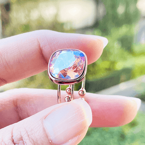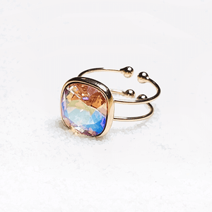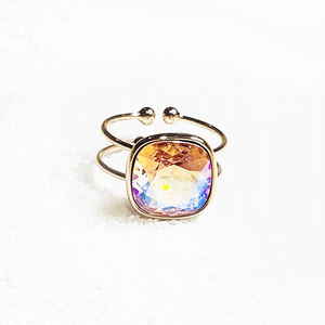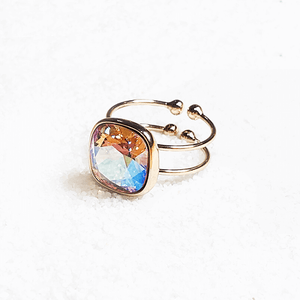 An elegant adjustable statement ring with light rose shimmer Swarovski crystal finished in rose gold, this ring is a magical must have.