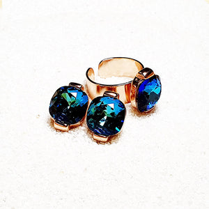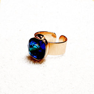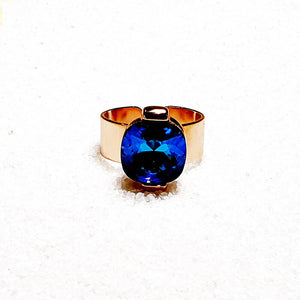 An energetic combination of classy and over the top, with the intensity of deep reef waters. Feel glorious with this adjustable statement ring in rose gold, featuring powerful bermuda blue swarovski crystal.