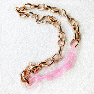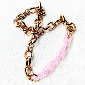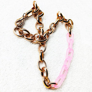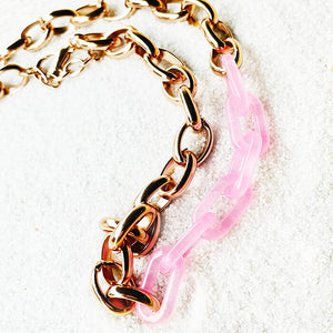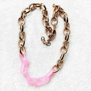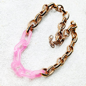 The pink links are made from naturally derived resin and can be worn centre or off centre based on your style for the day.