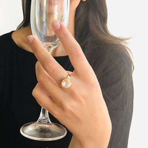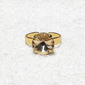 Silk, genuine swarovski crystal with that glimmery classic gold goodness set in a narrow, comfortable - adjustable - gold band plated twice over with 24k gold. An ideal ring to wear when you commit to the joy that life can bring, regardless of where you are and how you wear it.