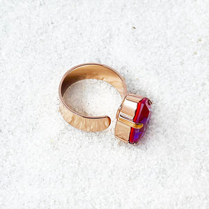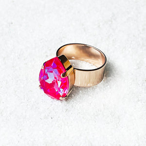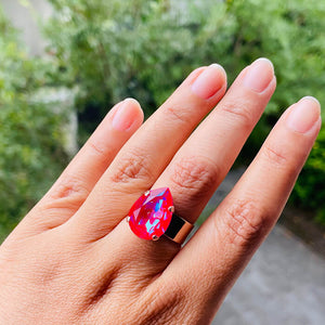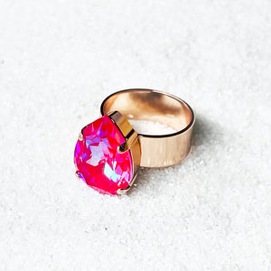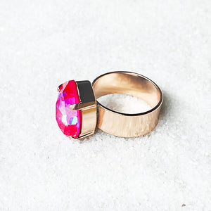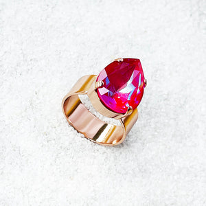 Featuring a magnificent pink Swarovski crystal with hues of red and blue, all set in a delectable hue of rose gold.