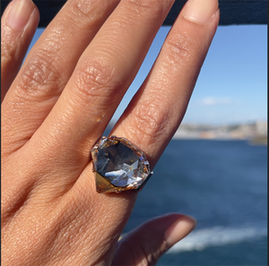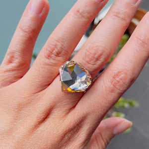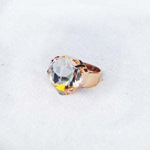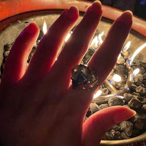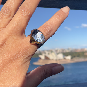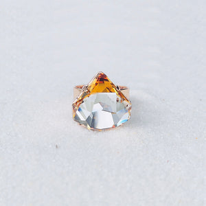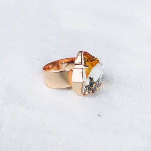 Astra doesn’t quietly complement an outfit, she is the outfit. This bold, adjustable ring is finished in glowing rose gold and crowned with a generous, asymmetrical heart-meets-shield crystal in molten copper tones that catch every scrap of light. The faceted stone shifts from warm amber to soft champagne, like golden hour bottled on your hand.